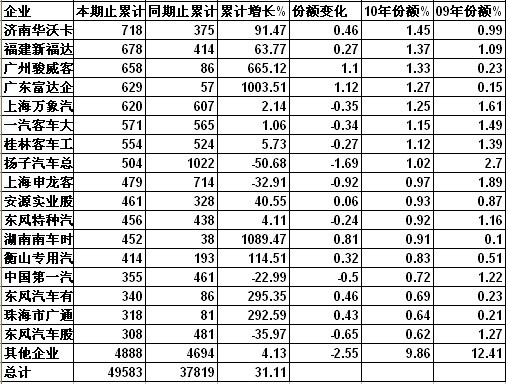 2010年1-11月,公交客車銷量前五名企業(yè)分別為鄭州宇通、蘇州金龍、廈門金龍、丹東黃海和重慶恒通,其中增幅最高的企業(yè)為鄭州宇通,累計增幅達(dá)134.29%,市場份額與同期相比提高了6.53個百分點。