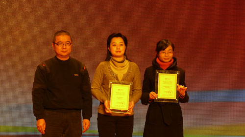 恒通客車(chē)高層領(lǐng)導(dǎo)雷燕(中)代表公司領(lǐng)取客車(chē)行業(yè)2010年度新聞大獎(jiǎng)
