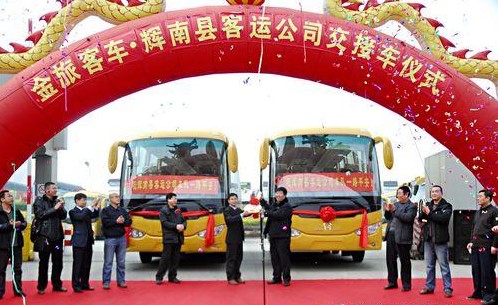 2011年1月14日上午,“金旅客車—輝南縣客運公司交接車儀式”在金旅公司海滄大客生產(chǎn)基地門前隆重舉行。輝南縣客運公司(以下簡稱“輝南客運”)李文華經(jīng)理、高鐵輝經(jīng)理以及廈門金旅公司彭東慶總經(jīng)理助理等領(lǐng)導(dǎo)和嘉賓出席了此次交接車儀式。