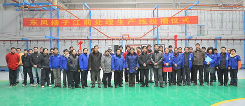 2011年21日下午1:58整,東風(fēng)揚(yáng)子江新基地前處理生產(chǎn)線投槽儀式在陰極電泳生產(chǎn)線旁舉行。