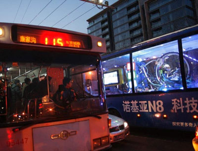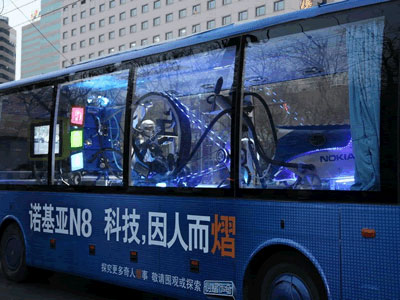 在大巴內(nèi)部,可以讓人暗爽;身在大巴外部,路人還可以觀賞到各種充滿奇思妙想的視頻。這些視頻展示的都是利用諾基亞N8所帶來的科技創(chuàng)熠傳奇,里面就有網(wǎng)友們熟知的《9平米豪宅,N8遙控智能家居》、《N8宿舍大戰(zhàn)泡泡龍》、《N8辦公室極品飛車》、《N8手機(jī)吊冰箱》、《手機(jī)翻拍"珍珠港"》。這些都是參加諾基亞N8"創(chuàng)熠傳奇"行動的頂尖奇客們的創(chuàng)熠作品。