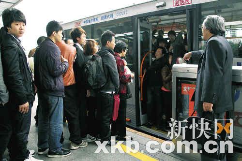 昨日上午8時(shí)50分,孟浩和記者進(jìn)入了BRT往東方向的崗頂站,該方向客流并不多,順利上車后,也很快到達(dá)此行的考察重點(diǎn)——上社站。盡管此時(shí)高峰期已漸過,但西行站臺(tái)仍然站滿了乘客。孟浩在卡位前觀察,發(fā)現(xiàn)進(jìn)站的車倒不少,但每次車門打開,都是塞得滿滿的,幾乎沒有人下車,于是,大家蜂擁而上,拼命地往里擠。一位穿黃衣服的小伙子是BRT管理人員,也束手無策。孟浩自覺充當(dāng)起臨時(shí)的管理員來,組織大家排隊(duì),而乘客也非常配合地站好了隊(duì)。但一連五六趟車沒空位的情況,也打破了孟浩這個(gè)“臨時(shí)管理員”的成就感,大家不得不擠上了車。在上社站站臺(tái),一位姓金和一位姓陳的白領(lǐng)也向孟浩反映說,這種上車難的狀況已經(jīng)持續(xù)了相當(dāng)長時(shí)間,由于有時(shí)擠不上車,導(dǎo)致上班遲到。