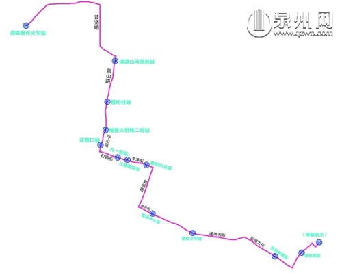 k1快線從東海開往福廈高鐵泉州火車站。開通之初,始發(fā)站先設置在泉州師院,終點站為高鐵泉州火車站,途經(jīng)路段和??空军c為:泉州師院、東海大街(東海濱城站)、通港西街(黎明大學站)、泉秀街(客運中心站)、刺桐路、豐澤街(泰和興業(yè)站、兒童醫(yī)院站)、九一街(九一街站)、打錫街、中山路(花巷口站、福建醫(yī)科大學附屬二院站)、泉山路(普明村站、清源山風景區(qū)站)、普賢路、高鐵站。線路全長21公里,中途??空军c10個。將來始發(fā)點延伸后,??空军c將增至11個,線路全長23.2公里。該線路初期將投入10.6米空調(diào)車20部,采用一票制,收費標準待核準。實行無人售票、ic卡付費方式,班次間隔時間8—10分鐘。k1線路運行成熟后,將開通夜班車,運行至22:35。