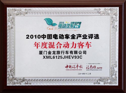 2010年度中國電動車全產(chǎn)業(yè)評選“年度混合動力客車獎”。