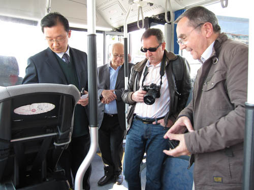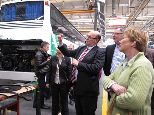 當(dāng)天上午,媒體團(tuán)一行參觀了安凱客車一廠、新能源制造公司及新廠區(qū),他們對廠區(qū)的規(guī)模、生產(chǎn)流程的管理、車間整潔有序的環(huán)境都驚嘆不已,尤其是工人們操作的工藝水平令他們非常關(guān)注。在新能源制造公司車間里,當(dāng)?shù)弥矂P純電動客車已經(jīng)批量商業(yè)化運營,并已經(jīng)在中國市場占領(lǐng)了80%以上的份額時,媒體團(tuán)代表們則被深深吸引。一輛黃色的展車讓歐洲媒體們非常關(guān)注,原來這就是2009年參加比利時車展的那臺純電動公交車,對于這臺新能源客車在展會上的表現(xiàn),他們的印象非常深刻。