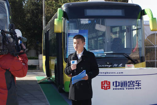 第一財經(jīng)記者對參展新能源客車進(jìn)行報道