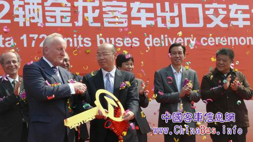 4月2日上午,廈門現(xiàn)代碼頭,172輛大金龍公交客車整齊排列,形成一個(gè)壯觀的方陣等待裝船出海,“中國(guó)客車 力征歐盟——馬耳他公交項(xiàng)目172輛金龍客車出口交車儀式”在這里舉行,當(dāng)ARRIVA馬耳他公司總經(jīng)理Keith Bastow從金龍汽車集團(tuán)副總經(jīng)理、大金龍董事謝思瑜手中接過金鑰匙,中國(guó)客車出口歷史在這一刻改寫,馬耳他交通部長(zhǎng)奧斯汀•蓋特先生親臨現(xiàn)場(chǎng)見證這一重要時(shí)刻,迎接172輛客車回國(guó)。