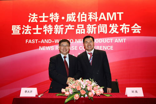 法士特汽車傳動(dòng)集團(tuán)公司董事長(zhǎng)李大開(左)與威伯科集團(tuán)副總裁劉良博士(右)