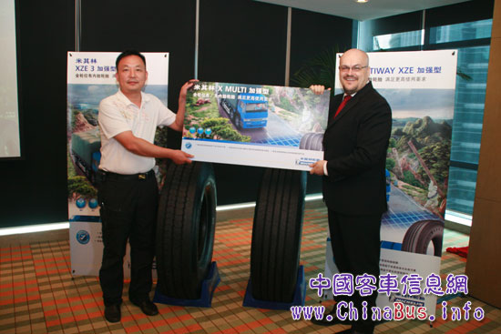 米其林(中國(guó))投資有限公司卡客車(chē)輪胎部市場(chǎng)總監(jiān) 法蘭克葉先生正式向用戶代表交付加強(qiáng)型卡客車(chē)輪胎