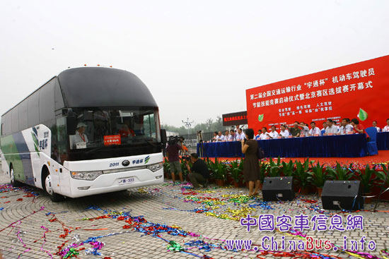 2011年8月31日,第二屆全國(guó)交通運(yùn)輸行業(yè)“宇通杯”機(jī)動(dòng)車(chē)駕駛員節(jié)能技能大賽開(kāi)幕式在北京順義奧林匹克水上公園前廣場(chǎng)盛大舉行。主辦方交通運(yùn)輸部副部長(zhǎng)馮正霖、總工程師周海濤、全國(guó)總工會(huì)紀(jì)檢組長(zhǎng)書(shū)記處書(shū)記王瑞生、中國(guó)海員建設(shè)工會(huì)副主席朱臨慶、北京市政府副秘書(shū)長(zhǎng)周正宇、福建省交通廳領(lǐng)導(dǎo)、交通運(yùn)輸部各司局領(lǐng)導(dǎo)以及各活動(dòng)參與省市交通廳、運(yùn)管局領(lǐng)導(dǎo)出席開(kāi)幕式,協(xié)辦方鄭州宇通客車(chē)股份有限公司相關(guān)人員、首屆“宇通杯”獲獎(jiǎng)代表和眾多媒體記者也出席了現(xiàn)場(chǎng)。