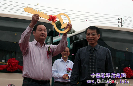 大金龍國內(nèi)銷售公司總經(jīng)理張其建(右)向余杭公交公司副總經(jīng)理陳連忠(左)交接金鑰匙