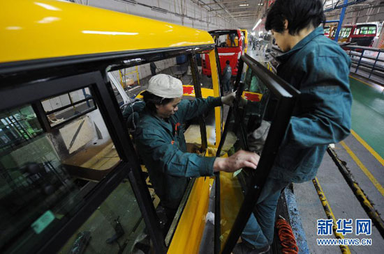 恒通客車工人將噴涂完畢的車體拉出噴漆車間(12月22日攝)。