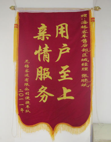 在售后服務(wù)方面,由蘇州金龍駐點(diǎn)服務(wù)經(jīng)理全天候?yàn)檐囕v提供保姆式服務(wù)。為了及時(shí)響應(yīng)服務(wù),駐無錫地區(qū)服務(wù)經(jīng)理張曉斌“十•一”黃金周沒有回老家探親,連母親病重臥床不起都無暇顧及。更讓客戶感動(dòng)客戶的是11月15日上午,張曉斌接到妻子在蘇州即將分娩的電話,但他因?yàn)榘才庞锌蛻襞嘤?xùn),不能耽誤已經(jīng)安排好的工作,只能稍作安排悄然掛斷電話……。舍小家為客戶,張曉斌通過自己嚴(yán)謹(jǐn)、細(xì)致、周到的服務(wù)贏得了客戶的贊譽(yù)。近日,客戶專程到公司送來“用戶至上、親情服務(wù)”的錦旗,以表達(dá)對(duì)無錫地區(qū)服務(wù)經(jīng)理張曉斌的謝意。
