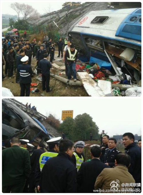 據(jù)湖南省雙峰縣公安局上午消息,今日9時(shí)許,一輛從四川開往廈門的長途客車在潭邵高速公路婁底段沖出護(hù)欄側(cè)翻下十幾米高的天橋。車上共計(jì)四十二名司乘人員,目前已有五人死亡,三十三人受傷。
