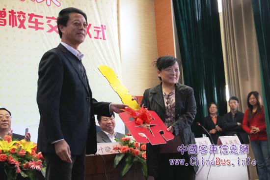 在儀式上,中通客車總經(jīng)理孫慶民和東關(guān)民族小學(xué)校長吳振榮交接了象征安全校車的“金鑰匙”。