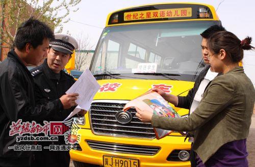 4月11日,在河北省滄州市一家幼兒園校車停車場,一位交警正在給該幼兒園校車駕駛?cè)撕陀變簣@負(fù)責(zé)人講解國家出臺的《校車管理條例》相關(guān)常識。同日,滄州市20個縣市區(qū)交警大隊的宣教民警走進(jìn)轄區(qū)小學(xué)及幼兒園,深入貫徹校車管理條例,并對校車駕駛?cè)速Y格進(jìn)行摸底審核,讓廣大校車駕駛?cè)苏嬲ㄐ\嚬芾項l例的所有規(guī)定。