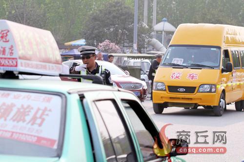 昨日,在珠江路神火大道路口西側(cè),一輛睢陽區(qū)新城實驗小學的校車經(jīng)過時,一輛出租車想和校車搶道,被執(zhí)勤交警攔下來(如圖)。