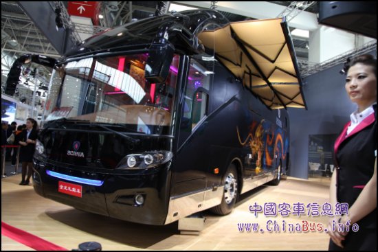 展位上方醒目的SCANIA•HIGER雙品牌LOGO,表明了它的身份。