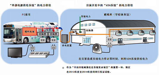 另外,豐田還不斷推進利用FC客車通過建筑物的電氣線路供給電力的V2H系統(tǒng)(Vehicle to Home,利用EV、PHV的車載蓄電池和FCV的燃料電池通過設施的電氣線路供給電力的系統(tǒng))的研發(fā)工作,旨在實現(xiàn)最大輸出功率為9.8kW和50個小時左右的連續(xù)電力供給能力,這一供電量相當于學校體育館約5天的照明用電量(1輛FC客車在氫充滿的狀態(tài)下,學校體育館的照明使用電力約為100kWh(1天開燈12個小時),照此進行計算)。未來,作為被經(jīng)濟產(chǎn)業(yè)省的“新一代能源·社會系統(tǒng)實證業(yè)務”所采用的“豐田市低碳素社會系統(tǒng)實證項目”的重要一環(huán),豐田預定在2013年度(2013年4月1日至2014年3月31日,以下類推)至2014年度期間實施假定為災害時向避難設施進行供電的驗證試驗。