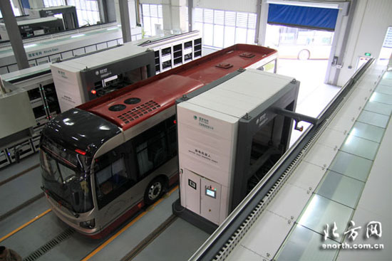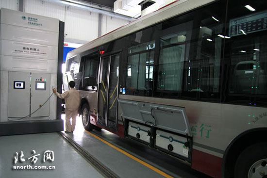 工作人員正在通過控制系統(tǒng)命令換電機(jī)器人為純電動公交車更換電池