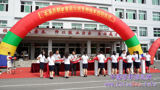 本溪市教育局和本溪滿族自治縣相關(guān)領(lǐng)導(dǎo)為校車啟動(dòng)儀式剪彩
