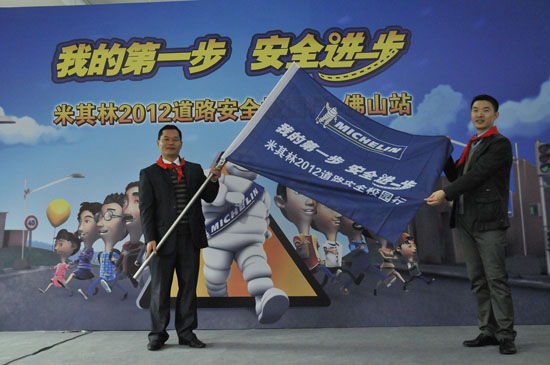 米其林(中國)投資有限公司 南區(qū)區(qū)域銷售經(jīng)理武志峰先生向佛山平洲博雅學(xué)校張新彬校長授予“米其林2012道路安全校園行”旗幟