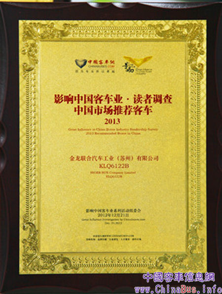 2012年12月21日,“第七屆影響中國(guó)客車業(yè)2012—2013年度客車行業(yè)讀者調(diào)查評(píng)選活動(dòng)”頒獎(jiǎng)典禮在北京隆重舉行,海格客車憑借2012年優(yōu)異的表現(xiàn),一舉摘得了2013年度“國(guó)內(nèi)市場(chǎng)、海外市場(chǎng)、新能源客車、專用校車”等四項(xiàng)大獎(jiǎng)。