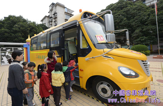 位于東渡的蒲公英幼兒園內,可載31人的大金龍新式長鼻子“智慧校車”XMQ6660ASD前,幾名小朋友在老師的帶領下,高高興興地坐上校車。