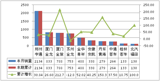累計銷售前5名依次為鄭州宇通、廈門金龍、廈門金旅、蘇州金龍和金華青年,累計銷量分別為2134輛、833輛、788輛、753輛和488輛。