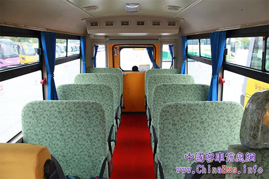 車廂內(nèi)飾采用了米色為主,座椅則采用綠色絨面卡通花紋裝飾。該車的座椅采用了一體式雙座椅,寬76 cm,深37 cm,靠背高71.5 cm,坐墊上沿?fù)?jù)地板高度36 cm,前后排間距75 cm,膝部間距30 cm。這種座椅空間設(shè)計(jì)基本能夠買足多數(shù)學(xué)生的乘坐舒適性。