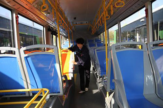 10月15日,在河北省邯鄲市高鐵站南公交樞紐站,一名公交司機(jī)在為純電動(dòng)公交車上路作準(zhǔn)備。