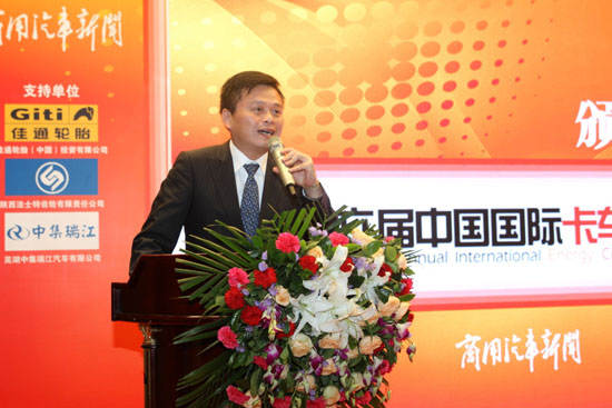 頒獎(jiǎng)典禮上佳通輪胎商用車(chē)胎部高級(jí)經(jīng)理蔡世盛發(fā)表節(jié)油感言