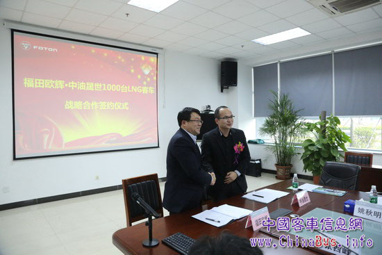 福田汽車副總裁、歐輝客車事業(yè)部常務(wù)副總經(jīng)理范現(xiàn)軍與深圳市中油晟世能源有限公司總經(jīng)理劉宇明簽署戰(zhàn)略協(xié)議