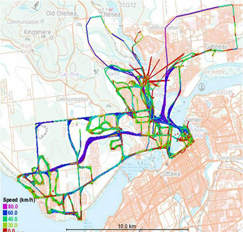 經(jīng)STO測算,在加拿大的加蒂諾和渥太華等城市道路上運行的大巴均速為23公里每小時,而比亞迪純電動大巴可以在保持平均車速的基礎上單次充電后行駛250公里。在未開空調(diào)的情況下,大巴每公里耗電約為1.3度電。在開啟空調(diào)滿載的情況下,則為每公里1.5度電。