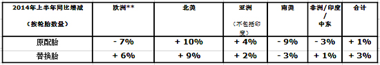 在歐洲,替換胎市場在上半年增長4%。在對比基數(shù)較低和經(jīng)銷商庫存水平正常的背景下,西歐實現(xiàn)7%的增長,與市場銷量表現(xiàn)一致。僅6月份,所有市場增長由冬季到來之前冬季胎的強勁銷售表現(xiàn)帶動,集團對此并未作出投入。受俄羅斯和烏克蘭的政治局勢和經(jīng)濟狀況影響,東歐市場萎縮10%。
