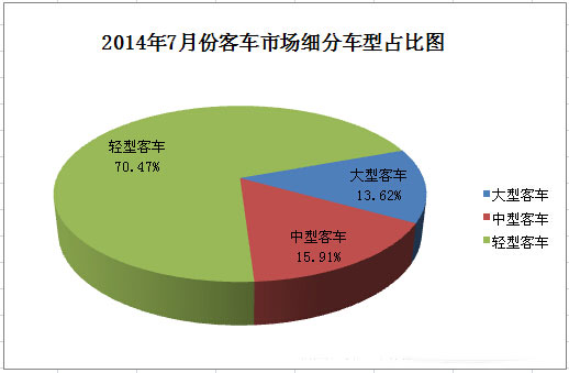 據(jù)中國汽車工業(yè)協(xié)會統(tǒng)計,2014年7月份,國內(nèi)客車(含非完整車輛)市場產(chǎn)銷49736輛和47868輛,生產(chǎn)環(huán)比下降3.36%,同比增長15.03%,銷售環(huán)比下降8.32%,同比增長19.16%(從6月-1.29%的增長率轉(zhuǎn)為正增長)。分車型看,大型、中型和輕型客車分別銷售6519輛、7618輛和33731輛,分別占客車市場份額的13.62%、15.91%和70.47%。