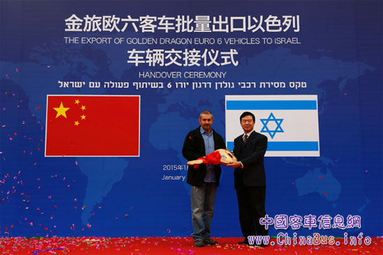 廈門金龍旅行車有限公司總經(jīng)理葉宏廷向以色列客戶交接金鑰匙