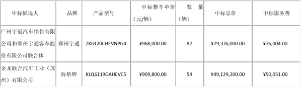 除了安凱外,第二贏家是宇通客車,在該項目中共中標(biāo)車輛103輛,中標(biāo)金額總計約1億元。宇通客車分別中標(biāo)了子項目一中數(shù)量21輛,中標(biāo)單價為93.8萬元,中標(biāo)金額為0.2億元;中標(biāo)了子項目二中數(shù)量82輛,中標(biāo)單價為96.8萬元,中標(biāo)金額為0.79億元。