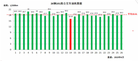 首先,該數據來源于湘潭市湘運公共交通有限公司(以下簡稱“湘運公司”),是該公司“101車隊4月份公里油耗表”上的最低油耗記錄。當然,作為湘運公司2014年12月新開通的插電式混合動力新能源公交線路,101路并非只有最低油耗“驚人”,其26臺公交車3、4月份平均油耗數據是18.4L/100km左右。