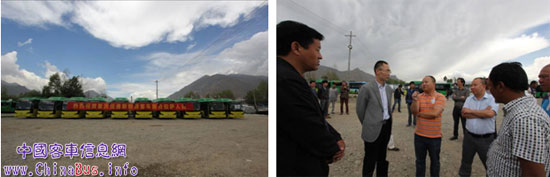 拉薩公交集團(tuán)總公司董事長曹志明(左四)在恒通客車副總經(jīng)理何濤(中)、總經(jīng)理助理趙勇(左二)的陪同下參觀恒通車輛