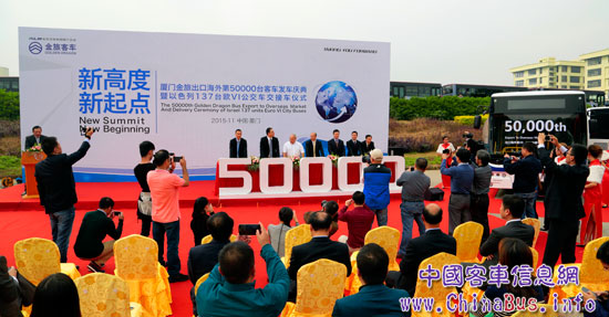 2015年11月30日上午,廈門金旅海滄基地內(nèi)比往日熱鬧許多,廈門金旅第5萬輛客車出口海外發(fā)車慶典暨以色列137輛歐Ⅵ公交車交接車儀式正在舉行。一排藍白相間掛著紅花的公交車靜靜地等待著發(fā)車的指令,會場臨時搭建的舞臺前碩大的“50000”數(shù)字,醒目而富有感染力。簡短的儀式過后,在人們的注視下,車輛緩緩駛出海滄基地的大門,這批車輛同時也讓金旅客車的出口數(shù)字突破5萬輛。截至目前,國內(nèi)客車行業(yè)出口數(shù)量達到5萬輛的企業(yè)還屈指可數(shù)。