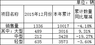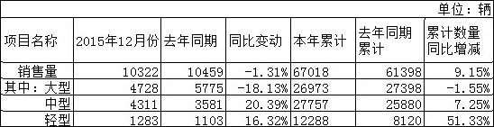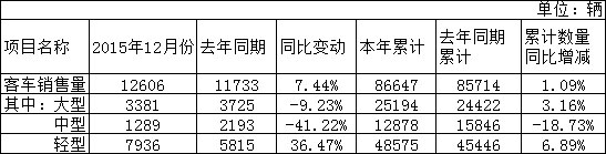 1月5日,宇通客車發(fā)布產(chǎn)銷數(shù)據(jù)顯示,公司2015年全年累計(jì)汽車銷量6.70萬輛,同比增長9.15%。其中,公司2015年12月實(shí)現(xiàn)汽車銷售量為10322輛,同比下降1.31%。