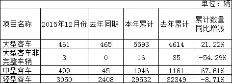 1月11日,四川西部資源控股股份有限公司發(fā)布產(chǎn)銷數(shù)據(jù)快報。數(shù)據(jù)顯示,2015年全年累計(jì)銷售客車2046輛,包括大型客車941輛,中型客車574輛,輕型客車531輛。其中,2015年12月份共銷售大型客車126輛,同比增長281.82%;銷售中型客車102輛,同比增長537.50%;銷售輕型客車72輛,同比下降-10.00%。