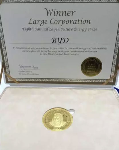 2016年1月18日,在阿聯(lián)酋阿布扎比超級豪華的國家展覽中心,全球矚目的扎耶德未來能源獎獲獎結(jié)果揭曉,比亞迪擊敗入圍最后一輪的兩家世界500強企業(yè),歷史性的摘得該獎桂冠,成為中國首家獲得大型企業(yè)類獎項的企業(yè)。比亞迪也成為全球唯一一家包攬該獎項大型企業(yè)類獎和個人終身成就獎的企業(yè)。這是中國企業(yè)歷史性的一刻,這也是全球可再生能源發(fā)展史上新的輝煌。