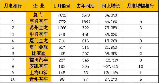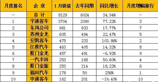 其中,鄭州宇通1月份銷售中型客車3704輛,繼續(xù)排名第一,同比增長77.22%;第二名東風(fēng)汽車公司銷售981輛,同比增長17.77%;第三名蘇州金龍銷售605輛,同比增長22.47%;第四名安凱客車銷售中型客車475輛,同比增長103.86%;第五名江淮汽車銷售463輛,同比增長14.32%。