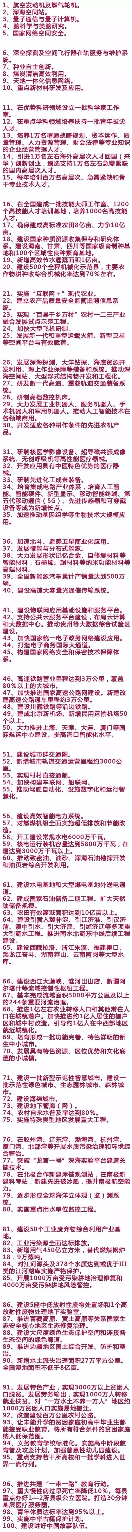 中國第十三個五年規(guī)劃綱要是國家戰(zhàn)略意圖的反映。記者從5日提交全國人大審查的綱要草案全文中摘取了未來五年中國計劃實施的100個重大工程及項目。