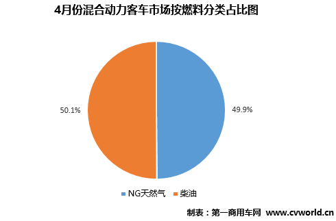 從燃料形式來(lái)看,4月份柴油混合動(dòng)力和柴/電混合動(dòng)力的混合動(dòng)力客車(chē)占比環(huán)比有所升高,從3月份的34.3%,升至4月份的50.1%;NG類(lèi)燃?xì)饣旌蟿?dòng)力和氣/電混合動(dòng)力的混合動(dòng)力客車(chē)占比從3月份的65.7%,下降至4月份的49.9%(803輛)。
