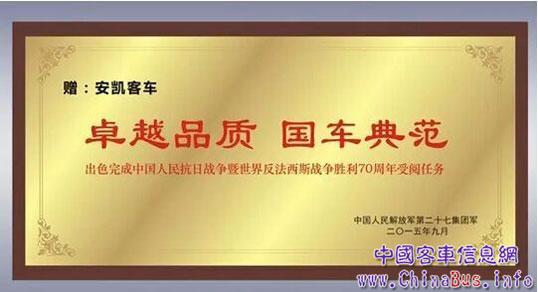 2015年9月3日“中國(guó)人民抗日戰(zhàn)爭(zhēng)暨世界反法西斯戰(zhàn)爭(zhēng)勝利70周年大閱兵”,安凱寶斯通承載抗戰(zhàn)老兵接受全世界人民的檢閱,更是具有重要的歷史價(jià)值,是進(jìn)行愛國(guó)主義教育、弘揚(yáng)和平精神的生動(dòng)載體。因此,國(guó)家軍事博物館收藏這輛安凱寶斯通受閱車,不僅是安凱客車的極大榮耀,也是中國(guó)客車業(yè)制造業(yè)的極大榮耀。