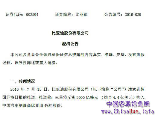 7月15日,比亞迪股份有限公司發(fā)布澄清公告。比亞迪注意到韓國經(jīng)濟(jì)日報(bào)的報(bào)道稱:三星將斥資5000億韓元 (約合4.4億美元)購入中國汽車制造商比亞迪4%的股份。