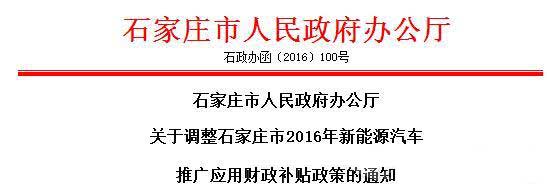 2016年5月,河北省財(cái)政廳、河北省工業(yè)和信息化廳印發(fā)了《關(guān)于省級(jí)新能源汽車推廣應(yīng)用補(bǔ)貼資金政策的通知》(冀財(cái)建〔2016〕80號(hào)),對(duì)2016年新能源汽車推廣應(yīng)用財(cái)政補(bǔ)貼政策進(jìn)行了調(diào)整。為與省級(jí)補(bǔ)貼政策相銜接,結(jié)合我市新能源汽車推廣應(yīng)用實(shí)際,現(xiàn)將我市2016年新能源汽車推廣應(yīng)用補(bǔ)貼政策相應(yīng)進(jìn)行如下調(diào)整: